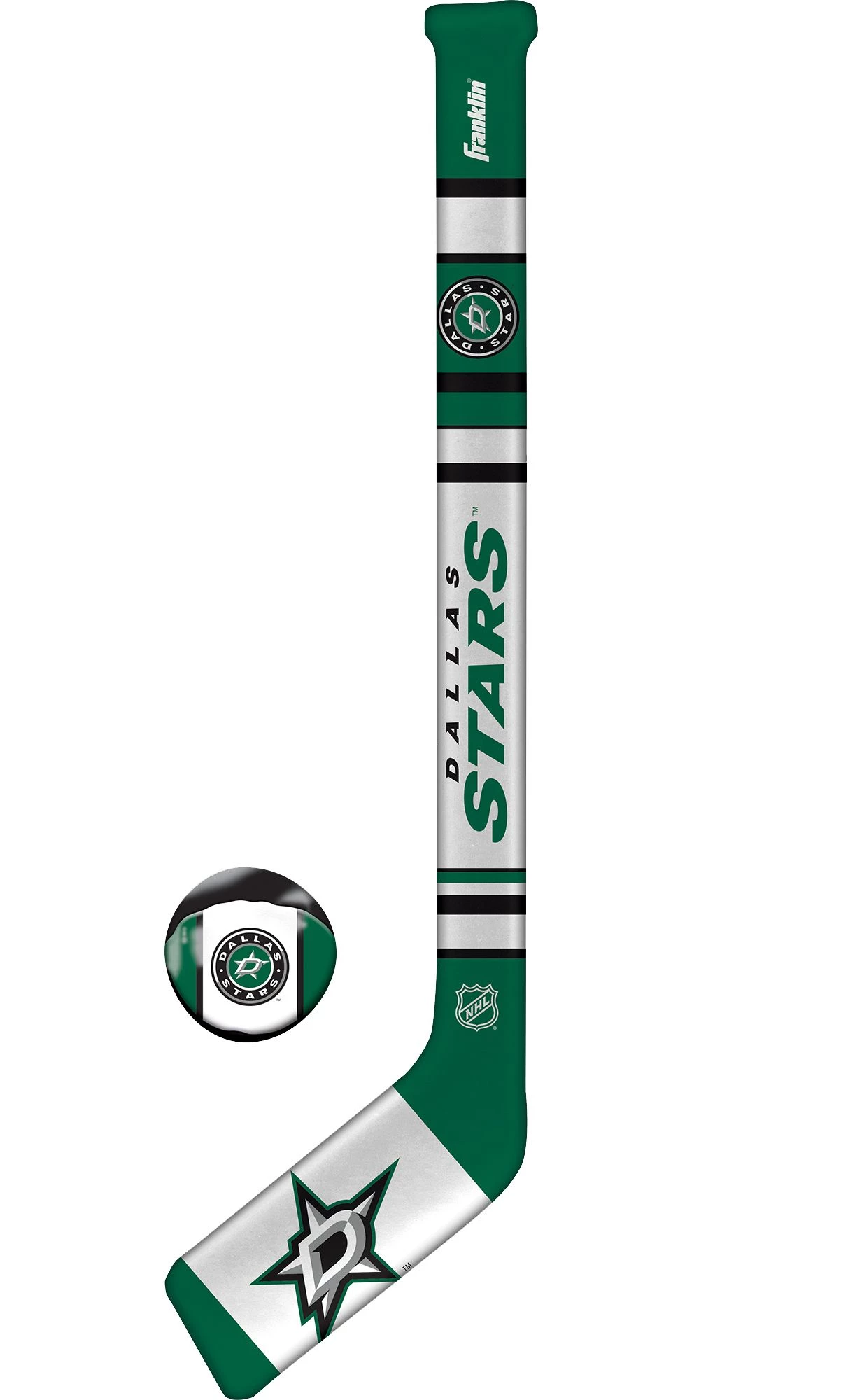 Reenact your favorite Stars moments with the Franklin® Dallas Stars Mini Hockey Set. Each mini hockey set includes a soft, team-inspired hockey stick and hockey ball, allowing you to perfect your skills indoors or out. Team colors, logos, and wordmarks decorate each piece of the set and remind you of your team as you work on your puck handling. Score a breakaway goal for your Stars with the Franklin® hockey set.