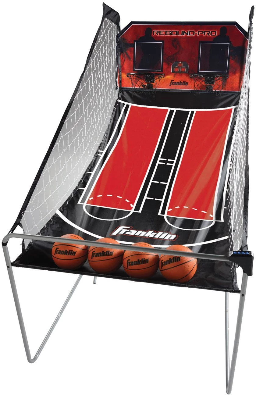 Take on your friends and family arcade-style with the Franklin® Double Shot Rebound Pro. The electronic basketball game features an extra-large playing area and eight different game options for hours of fun. The Double Shot Rebound Pro is extremely durable with 7/8″ thick steel tubing for support and a sturdy metal design built for competitive play. Storage is quick and simple, folding into a storage position within seconds.