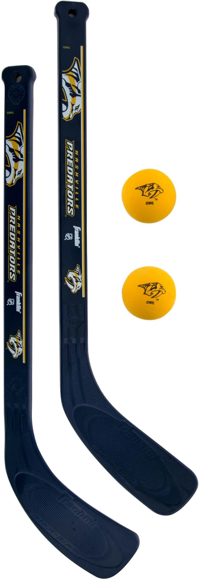 Earn your way onto the top power play unit with the Franklin® Nashville Predators Mini Stick Set. You are a natural born scorer thanks to the SHOT ZONE® textured blade. High-impact plastic offers durable construction while the 20″ stick keeps you in scoring range at all times. Salute your favorite team with the Predators wordmark and logo scanning your shaft. You are a mini hockey master with the Franklin® stick set.
