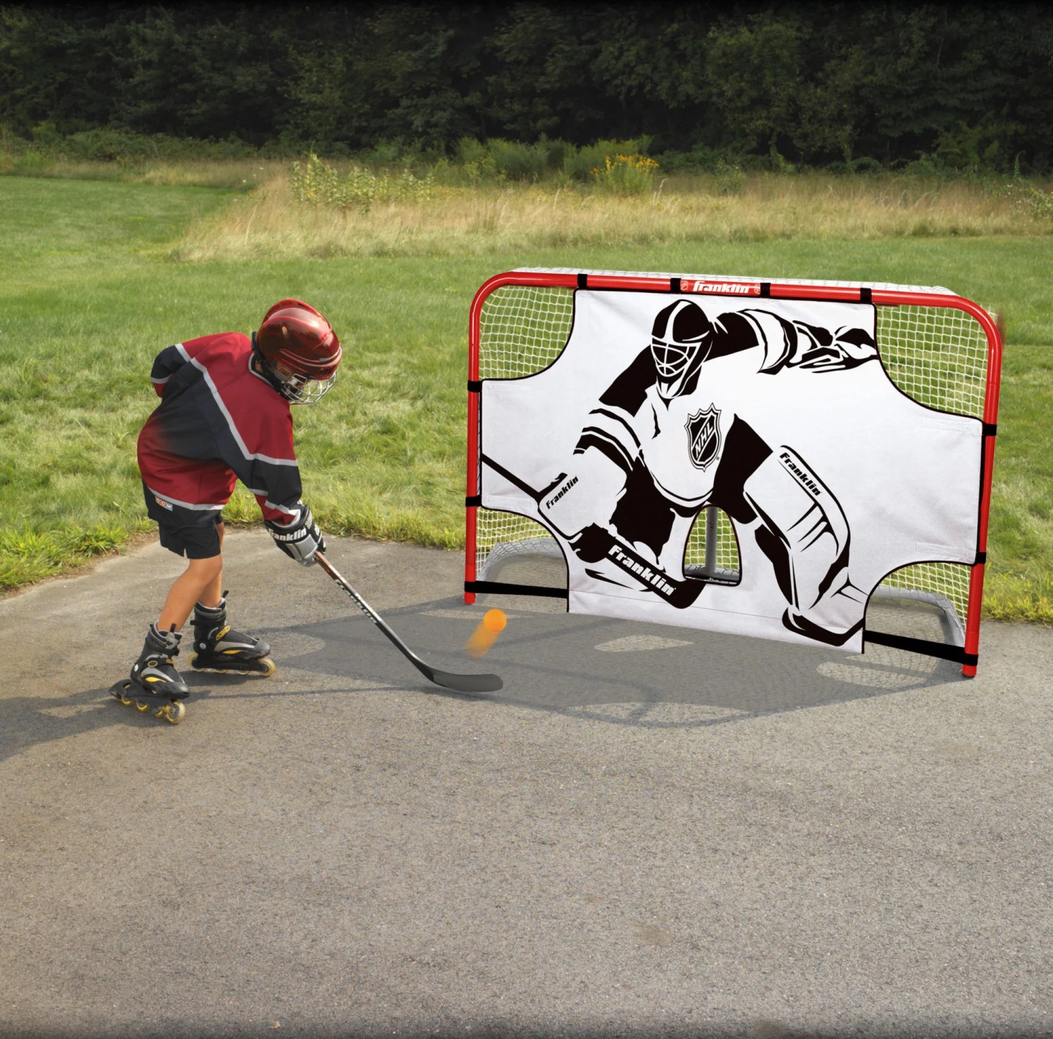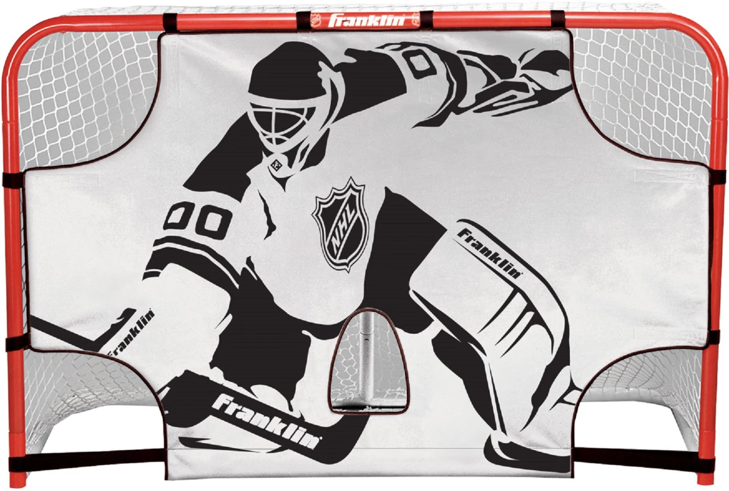 Improve your accuracy and shooting with the Franklin® NHL® Tournament Shooting Target. This street hockey target is designed to fit goals measuring 54″ wide x 44″ height. The goalie graphic is printed on durable 210D waterproof material with clearly defined shooting targets. The Franklin® Tournament hockey target also features adjustable self-stick straps make attachment easy so you can start practicing that power shot right away.