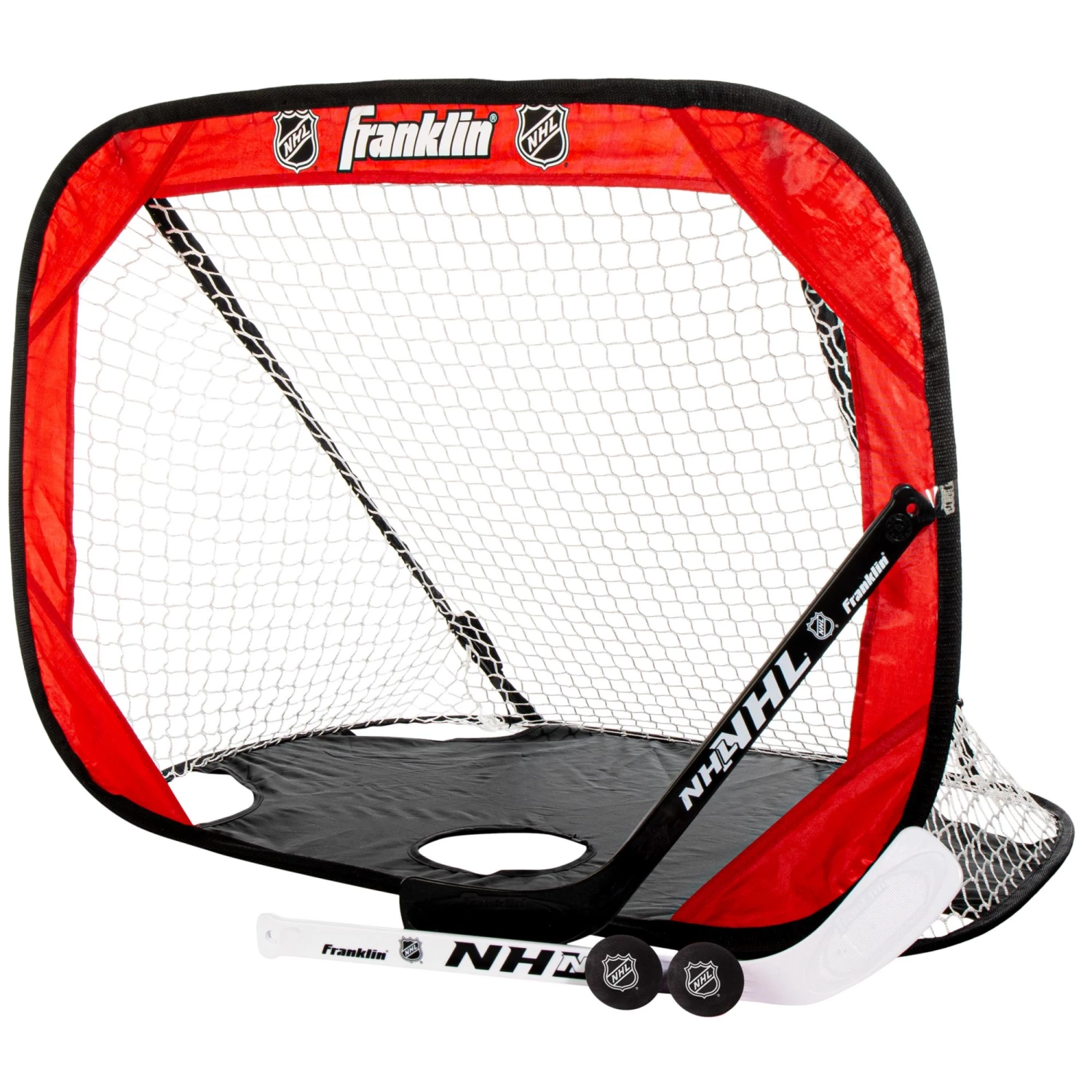 - Set Includes: mini popup goal, 2 knee hockey sticks, 2 mini foam balls, and a carry bag