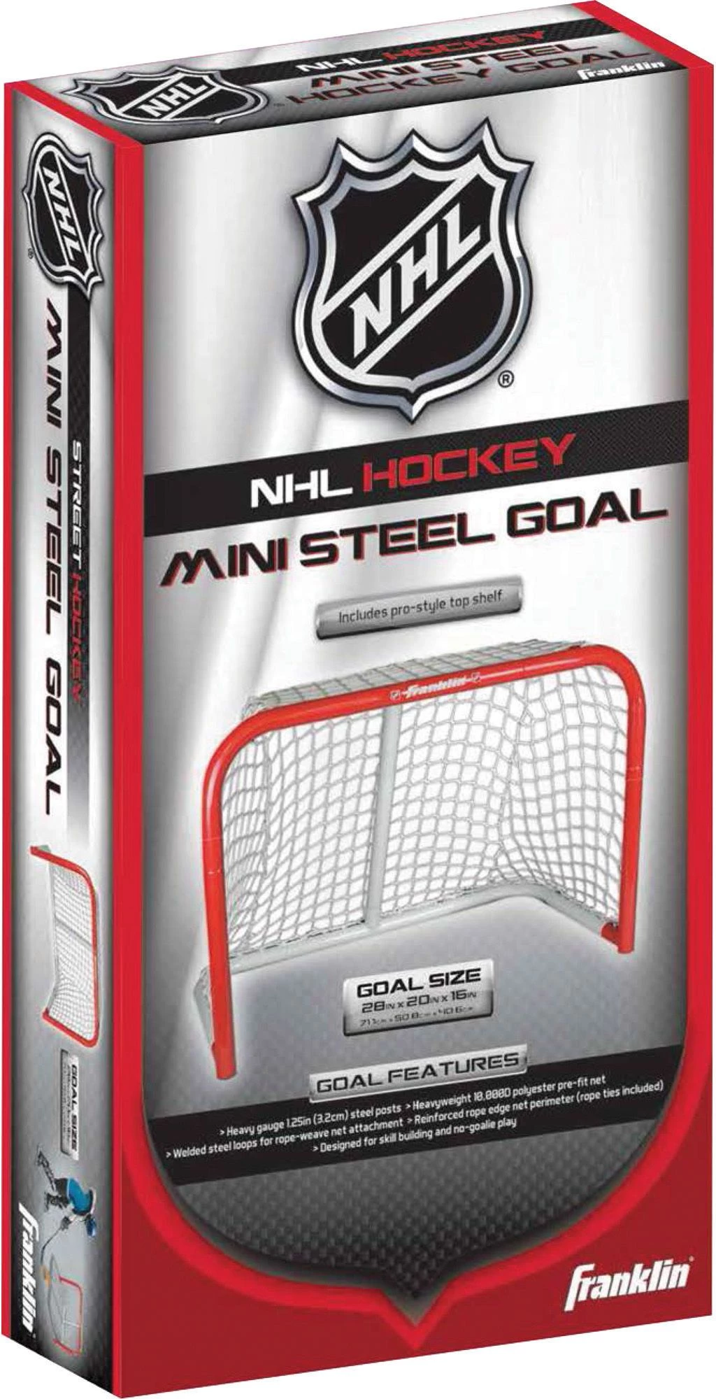 The Franklin® NHL® Mini Steel Hockey Goal is great for skills training in your driveway or an intense game of mini hockey in your basement. With a pro-style top shelf and back support brace, this mini hockey net has an authentic look and build. Premium heavy gauge steel tubing and heavyweight polyester pre-fit net are built to last in a mini hockey net that is great for the player of all ages and abilities.