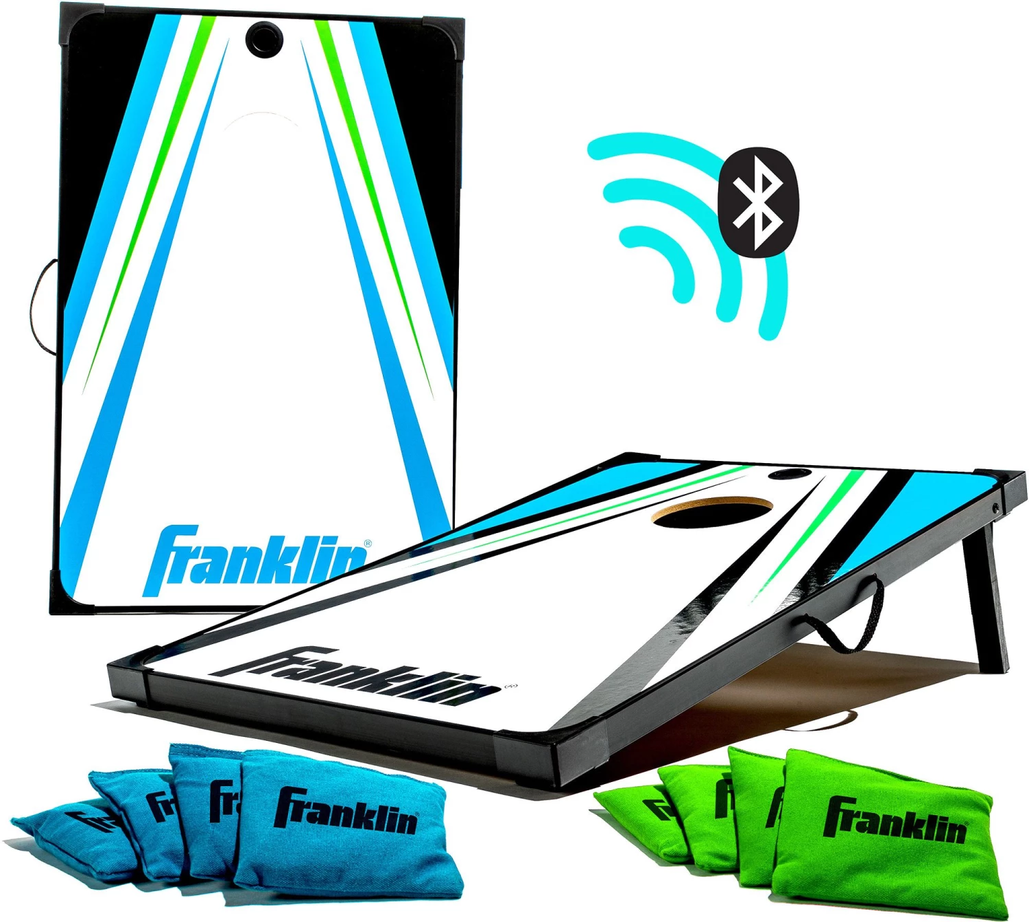 - The set includes all you need for a day of fun: (2) Bluetooth speakers, (2) 36″ x 24″ cornhole targets with (8) brightly colored 6″ bean bags with premium stitching and fill