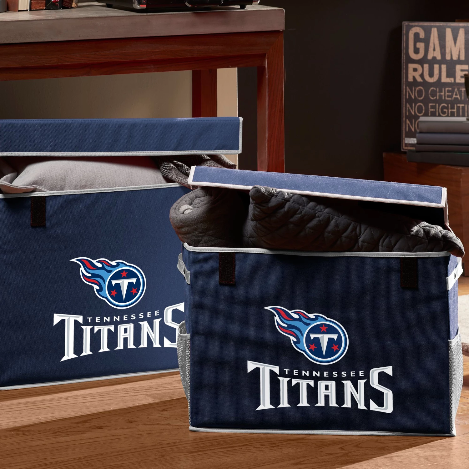 Stay organized and represent your favorite team with the Franklin® Tennessee Titans Footlocker Bin.