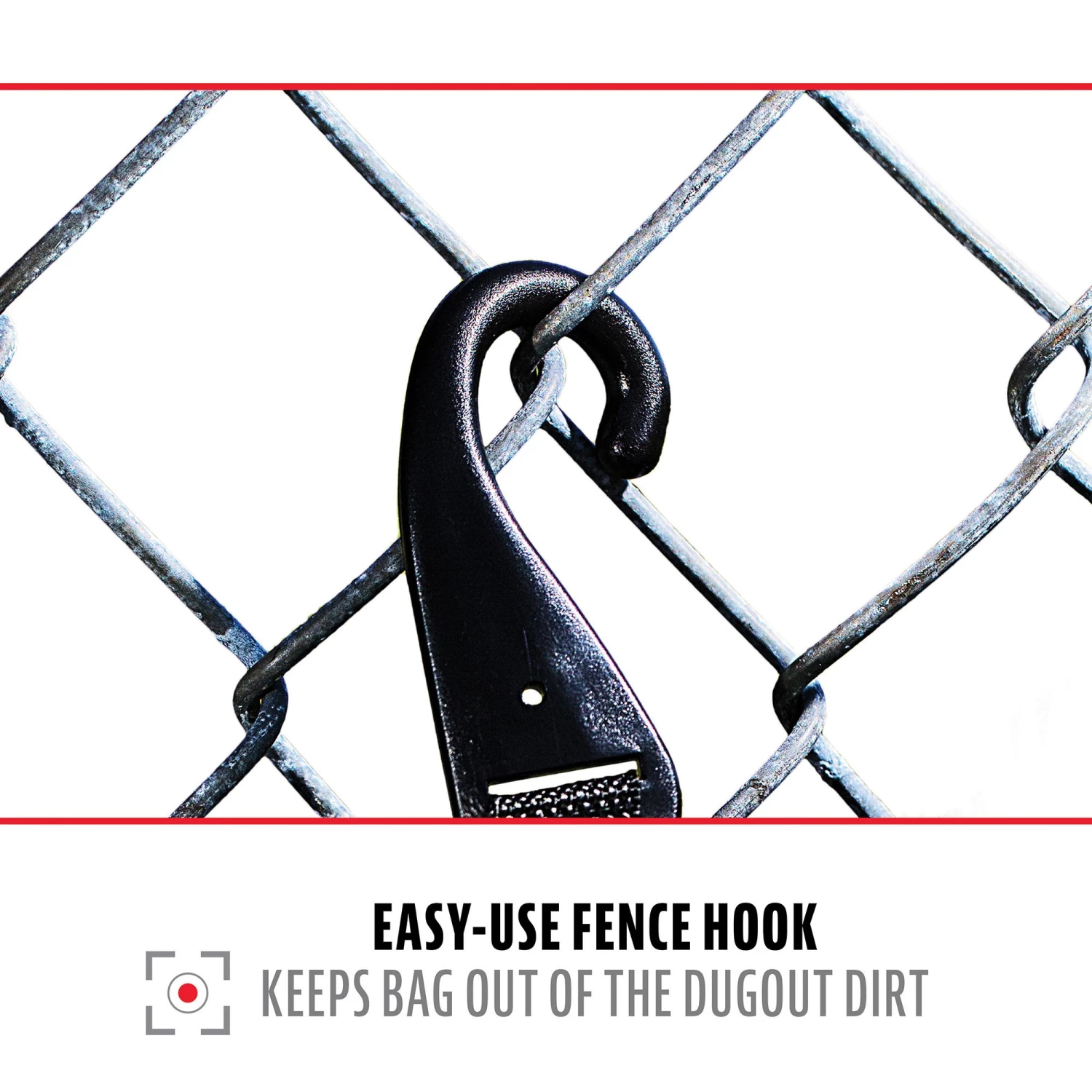 - Convenient easy-use fence hook that keeps the bag out of the dirt in the dugout